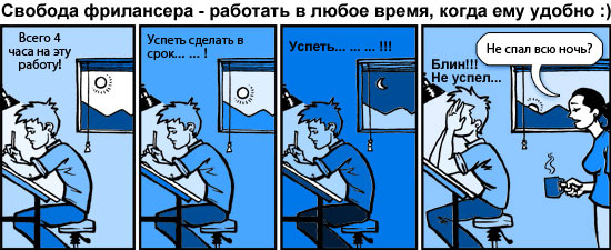 владелец одной из бирж фриланса. Поэтому о первых 12-ти страницах, где автор пытается "надеть на Вас розовые очки", я даже не буду говорить. Зачем?! Правда, всё-таки не удержался и, прочитав полную чушь(!) (страница 8, пункт 5), решил добавить один рисунок, очень точно отражающий самую суть фриланса.