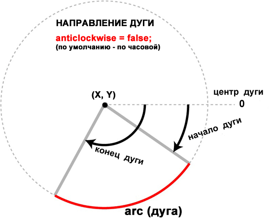 *Prim! Параметр anticlockwise сейчас установил в значение "false", т.е. рисовать по часовой стрелке, но можно было бы его и НЕ задавать. По умолчанию - это значение и так стоит в "false", т.е. рисует по часовой стрелке, а если выставить ему "true", тогда будет рисовать против часовой. Пример дуги вывел на экран, а подробности её создания в комментариях к коду. Сделал пособие (схему) для рисования различных дуг: